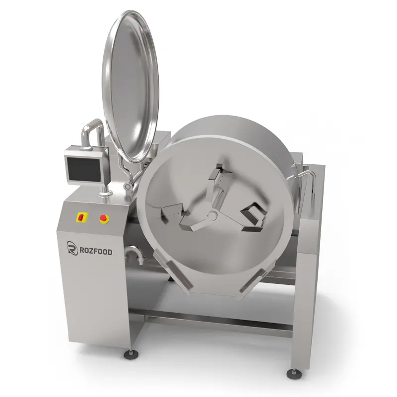 La olla de cocción con sistema basculante y AGITADOR, desarrollada y fabricada por Rozfood LLC, es una unidad industrial versátil diseñada para la preparación de una amplia variedad de productos alimenticios. Es ideal para cocinar y freír carne picada para productos semielaborados, saltear cebollas, preparar guisos de verduras o carne, salsas, sopas, mermeladas, confituras y mucho más.