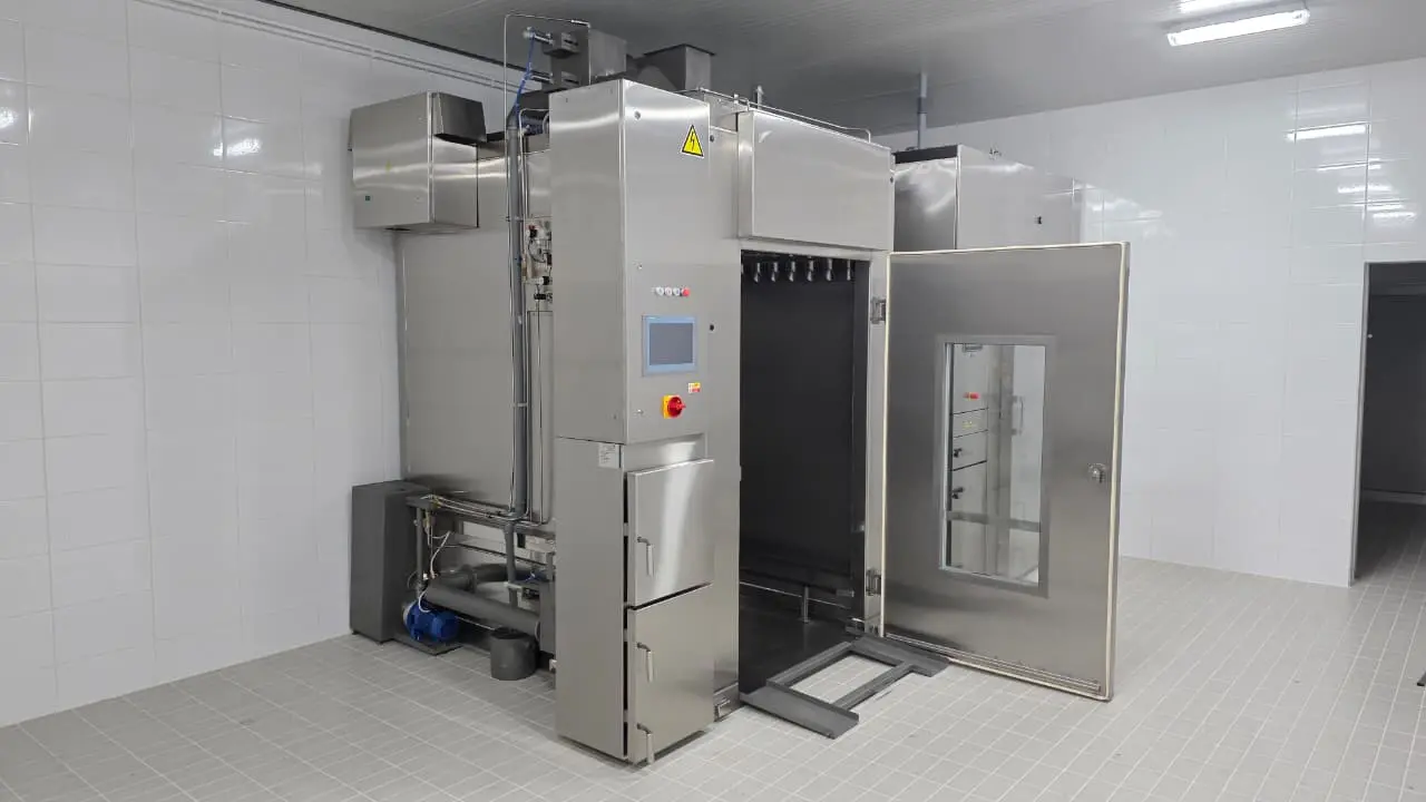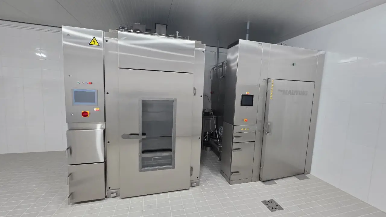 La cámara de ahumado y cocción de KOMPO North America Inc. es una solución automatizada para procesar carne, aves, pescado y productos lácteos en instalaciones de México, Colombia y América Latina. Con capacidad para hasta 3 carros estándar, permite realizar ciclos completos de ahumado, secado, cocción y calentamiento final en un solo equipo. Ofrece control preciso de temperatura, humedad y temperatura del núcleo (Delta T), adaptándose a las condiciones locales de cada planta. Disponible con calefacción eléctrica, a gas o por vapor, y respaldada por soporte técnico, instalación y repuestos en toda América Latina.