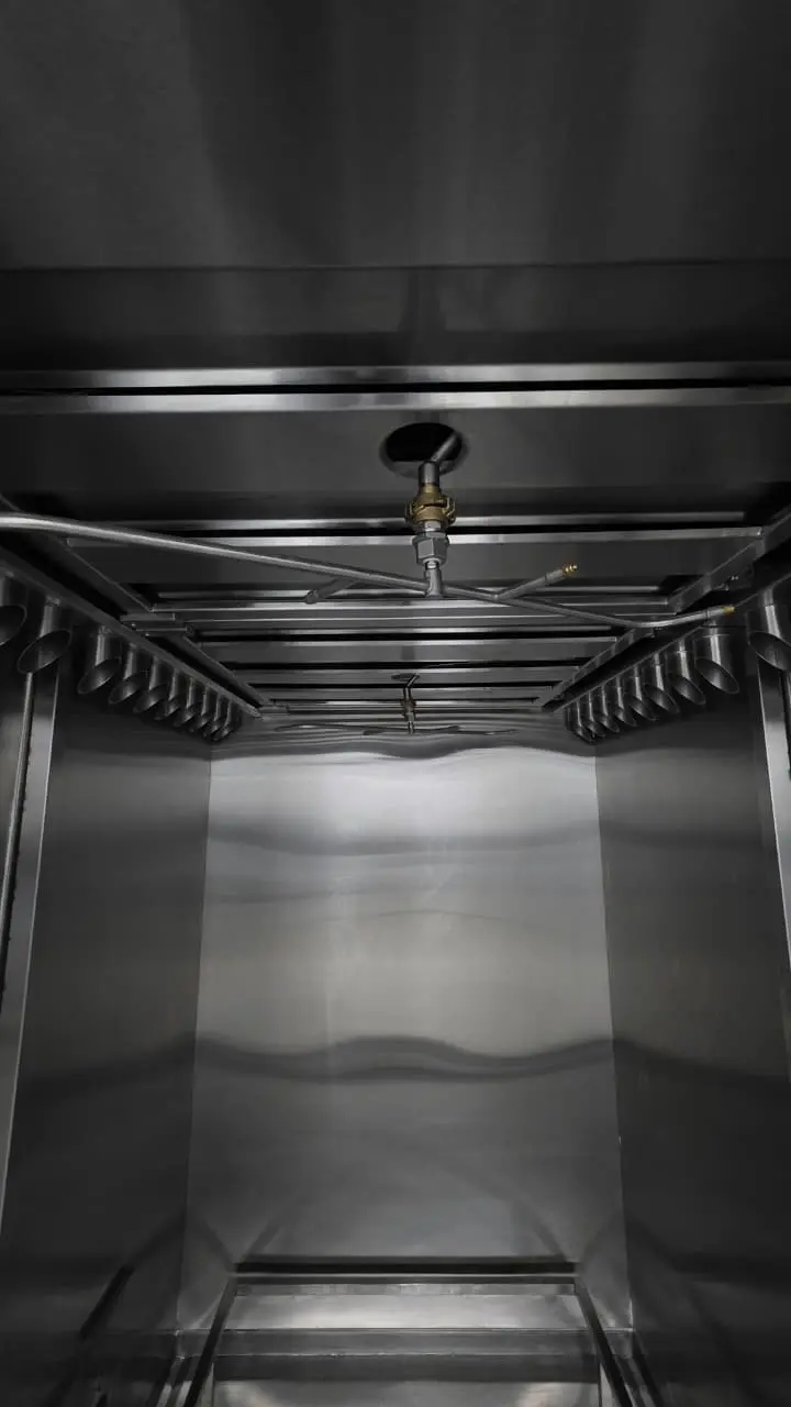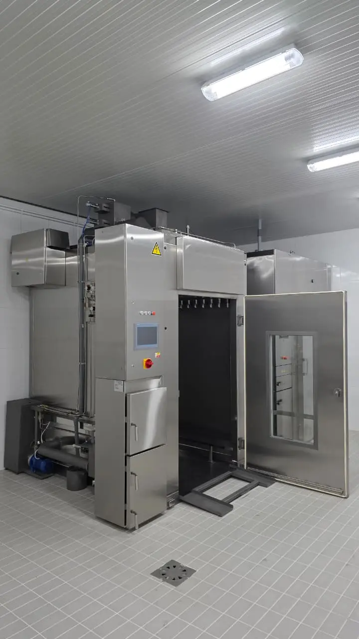 La Cámara de Ahumado y Cocción para 2 Carros de KOMPO North America Inc. es un sistema automatizado de tratamiento térmico diseñado para procesar carne, aves, pescado y productos lácteos en instalaciones de México, Colombia y América Latina. Esta cámara acepta hasta tres carros estándar (≈ 0.7 × 0.7 × 1.4 m por carro) y permite realizar ciclos completos de ahumado, secado, cocción y calentamiento final en un solo equipo.