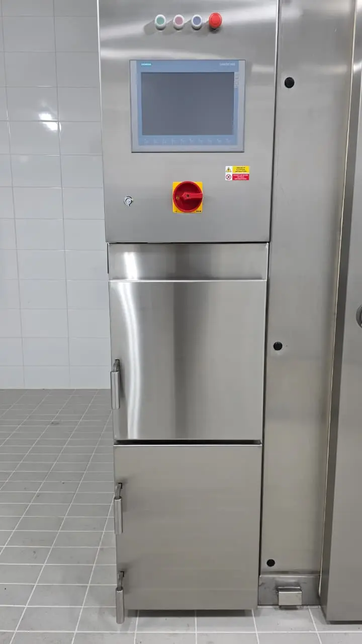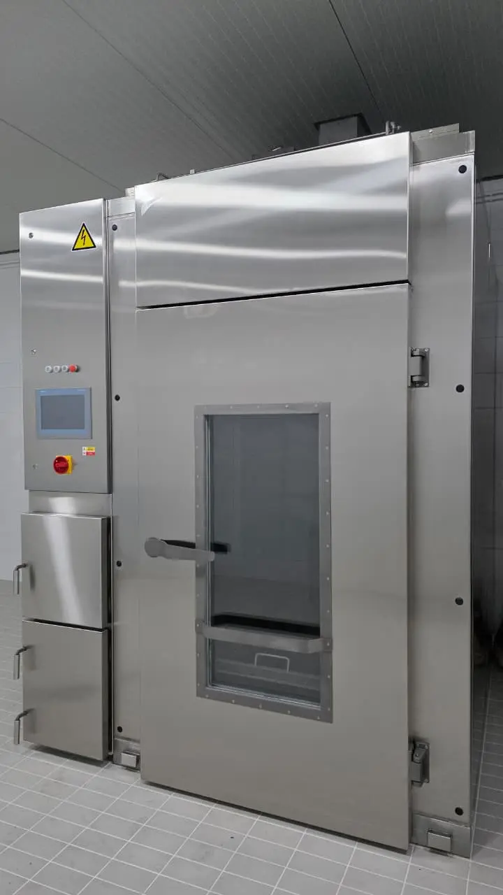 Construida con paneles de acero inoxidable AISI 304 rellenos de lana de vidrio (o espuma PUR opcional), ofrece alta eficiencia energética y durabilidad higiénica. El sistema de control programable soporta hasta 100 programas de proceso con 100 pasos cada uno, permitiendo un control total sobre temperatura, humedad, temperatura del núcleo (Delta T) y tiempos. La cámara es compatible con calefacción eléctrica, a gas o por vapor, adaptándose a las condiciones locales de cada planta.
