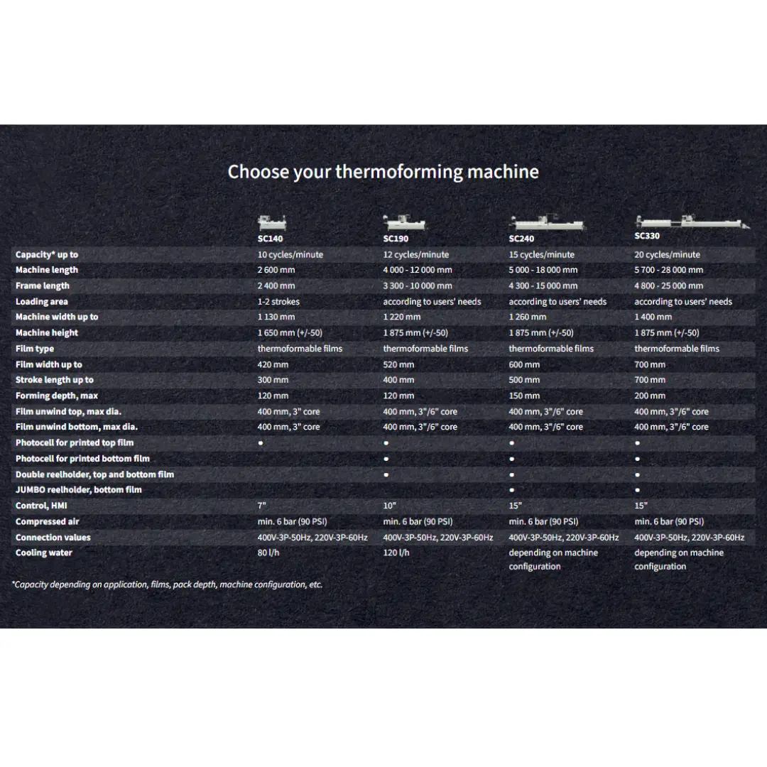 El SC330 es el modelo insignia dentro de la línea de termoformadoras — desarrollado específicamente para operaciones que requieren los anchos de película más amplios, las mayores profundidades de formado y las velocidades de ciclo más altas disponibles en su categoría. Con un ancho máximo de película de 700 mm, una longitud de carrera de hasta 700 mm y una profundidad de formado de 200 mm, esta máquina se adapta a una amplia variedad de formas y tamaños de envase, desde charolas poco profundas hasta empaques de gran volumen para anaquel.